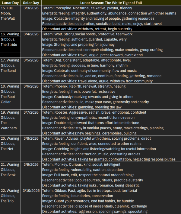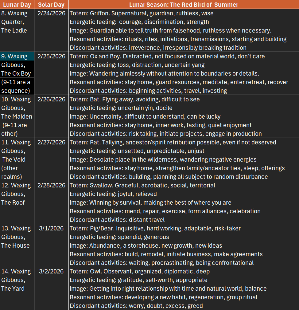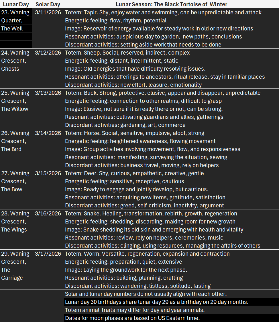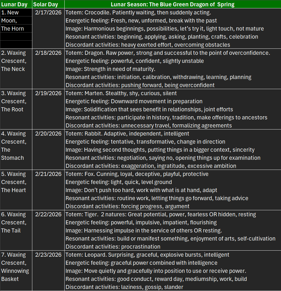 In this version of a lunar calendar, loosely based on the traditional Chinese lunar calendar, the month begins with the blue green dragon of Spring that brings renewal and fresh growth. The red bird of Summer warms us as we enjoy bounty and expansion. The white tiger of Fall protects us as we harvest and prepare. The black tortoise of Winter guides us as we rest and store up energy for spring.