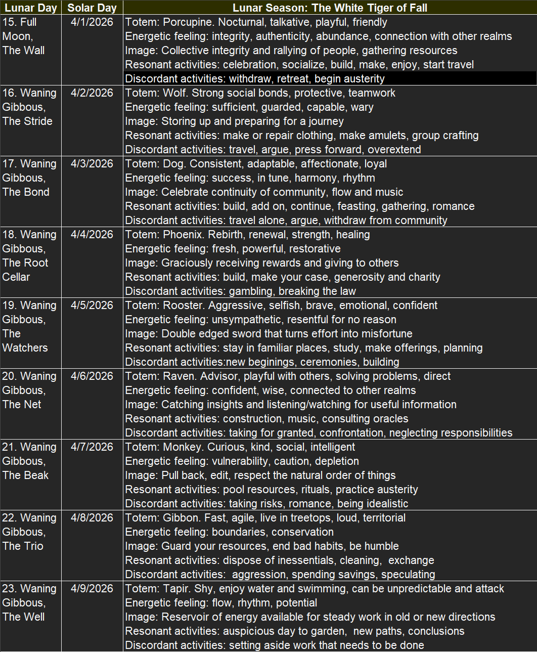 In this version of a lunar calendar, loosely based on the traditional Chinese lunar calendar, the month begins with the blue green dragon of Spring that brings renewal and fresh growth. The red bird of Summer warms us as we enjoy bounty and expansion. The white tiger of Fall protects us as we harvest and prepare. The black tortoise of Winter guides us as we rest and store up energy for spring.